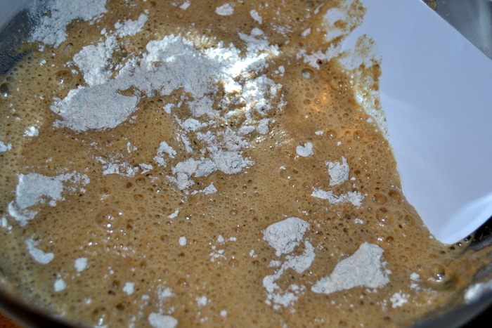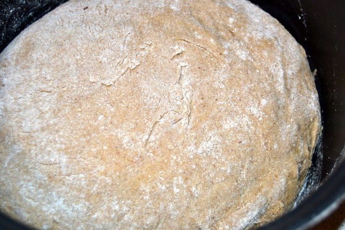 Затем в тесто-опару добавляем оставшиеся ингредиенты и вымешиваем тесто пока не станет отлипать от рук. Муку не добавляем! Сформировать шар. Миску присыпать мукой, уложить тесто, накрыть полотенцем и оставить на 45 минут. Затем еще раз обмять тесто, скатать в шар, вернуть в миску, накрыть и дать отдохнуть еще 45 минут.