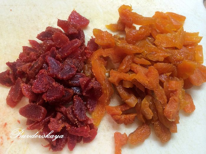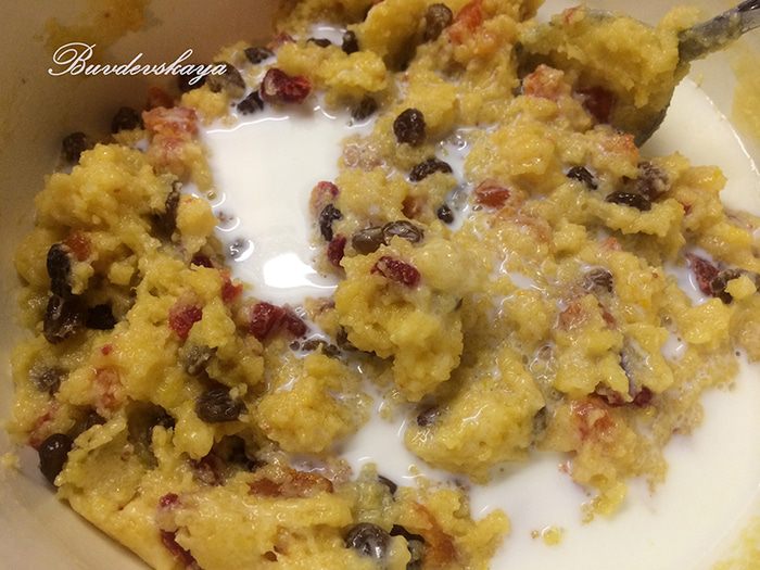 По вкусу добавляем в тесто сухофрукты — изюм без косточек, курагу или сушеную клубнику. Здесь все зависит только от вашей фантазии! Перед тем, как добавить их в тесто, не забудьте их порезать на кусочки.