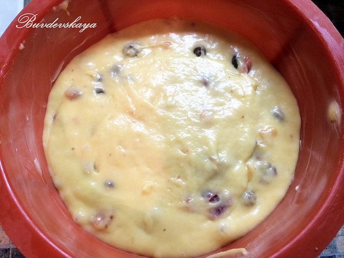 Форму для выпечки смазываем сливочным маслом и заполняем на три четверти — так как наше тесто поднимется! Ставим в духовку, разогретую до 180 градусов на час.