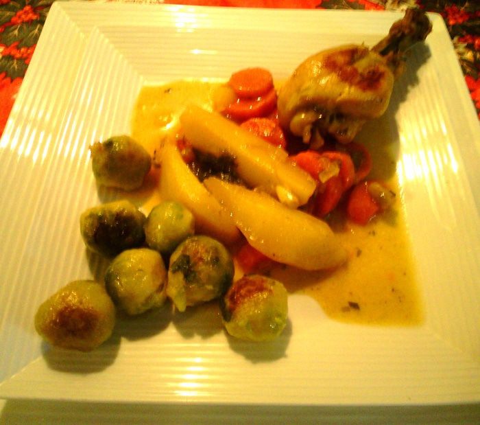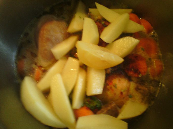 Голени чистим от кожи, в кастрюлю кладем 2 ст. л. оливкового масла, обжариваем голени до золотистого цвета. Добавить мелко нарезанные лук, чеснок, кориандр, сельдерей, обжариваем ещё пару минут. Нарезать морковь и картофель, положить в кастрюлю, налить 400 мл воды, добавить специи, половину соленого лимона. Накрыть крышкой и готовить 40 минут.