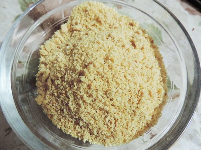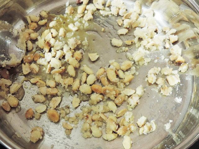 Застывшую карамель с арахисом ломаем на кусочки и измельчаем. Я смолола в мельничке достаточно мелко, но не в муку. Мелкие кусочки должны присутствовать в креме для хруста.