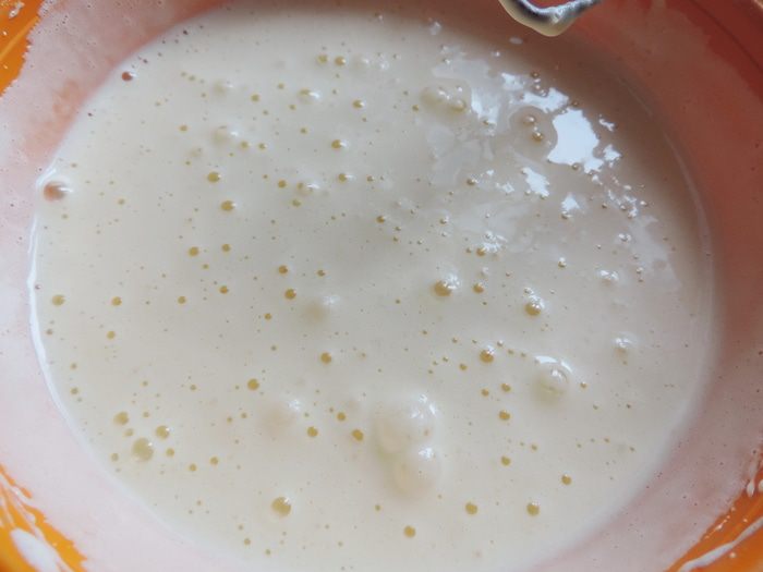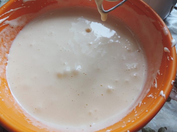 Теперь добавляем тонкой струйкой кипящую молочную смесь и продолжаем взбивать. Масса станет более жидкой и воздушной.