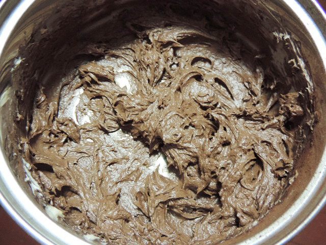 Масло комнатной температуры взбиваем, понемногу добавляем сгущенку комнатной температуры. В конце взбивания добавляем коньяк и какао (столовую ложку я набирала с горкой).