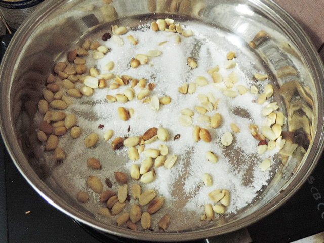 Тем временем займемся пралине. Очищенный арахис обжарим на сковороде до слегка золотистого цвета. На сковороду высыплем сахар.