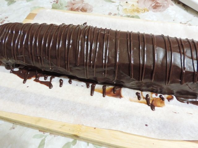 Поливаем наш рулет глазурью. Я отложила столовую ложку в кондитерский мешок со срезанным уголком (можно заменить файлом или пакетиком от молока) и нарисовала полосочки для красоты:)