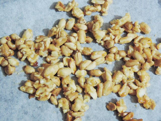 Когда сахар станет светло-коричневым и весь арахис покроется этой карамелью, выкладываем его на пергамент и даем полностью остыть.