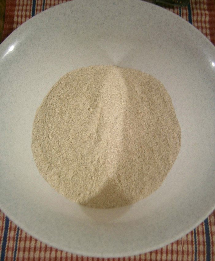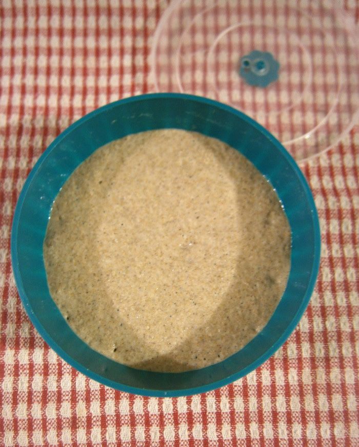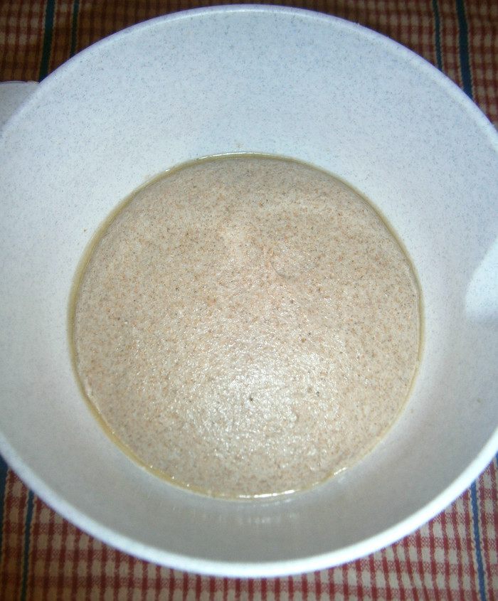 Закваску размешать с водой (воду влить не всю, примерно 300 мл., остальную воду будем добавлять при замешивании теста) и дрожжами (на кончике ножа).