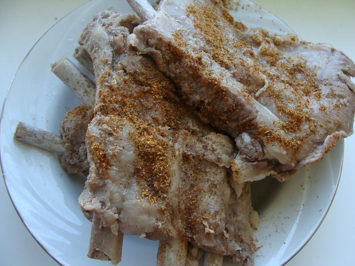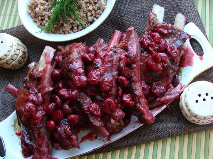 Крахмал развести небольшим количеством воды, влить в соус, варить до загустения. Положить в соус ребрышки и прогреть. Подавать с картофелем.