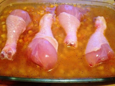 Залить кипятком или горячим бульоном, перемешать, выложить в шахматном порядке ножки (посоленные и поперченные). У меня 4, но лучше на эту порцию 6-8 шт.