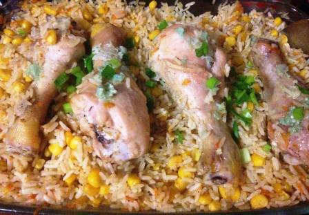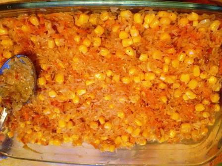 Форму для запекания смазать растительным маслом, всыпать сухой рис, отцеженную от жидкости кукурузу, зажарку из моркови и чеснока.