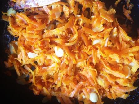 Морковь и чеснок очистить. Морковь натереть на крупной терке, чеснок мелко порезать.