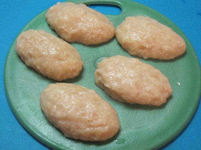 Сформировать из получившегося фарша длинные котлеты. Чтобы легче формировались котлеты, смачивать руки холодной водой. Можно перед формовкой котлет фарш поставить на 30 минут в холодильник.