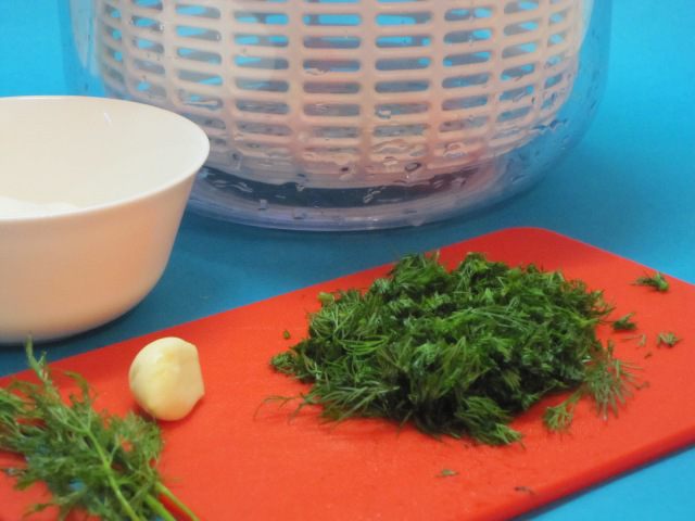Для соуса мелко нарезать укроп, чеснок пропустить через пресс.