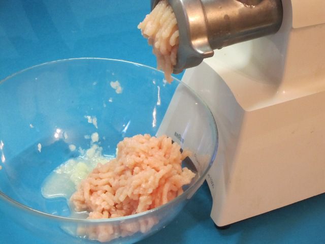 Куриное филе вымыть, нарезать на кусочки и пропустить через мясорубку.