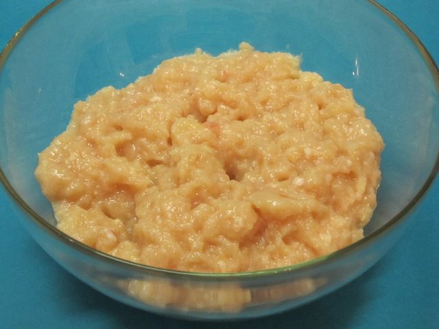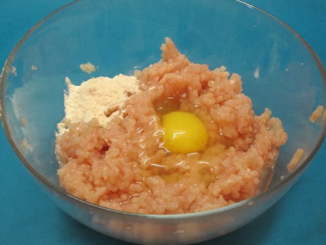 Добавить в куриный фарш натертый на мелкой терке очищенный лук, яйцо, соевый соус, муку и оливковое масло. Чуть присолить.