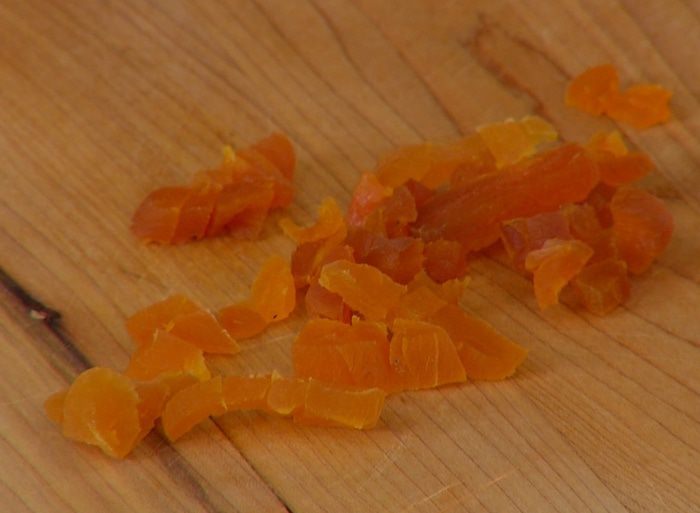 Разложить в шоколадные круги орехи, курагу и изюм.