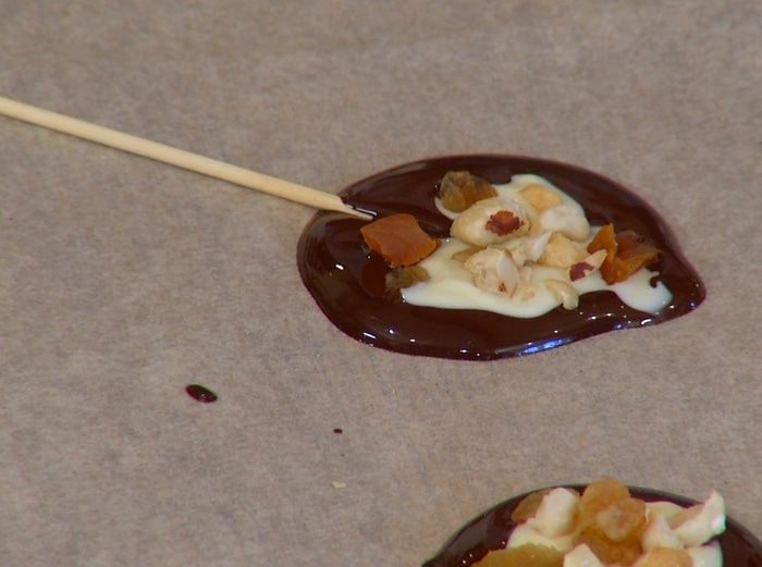 Поместить на кружки небольшие деревянные шпажки, чтобы получилась конфета на палочке. Дать шоколаду полностью остыть.