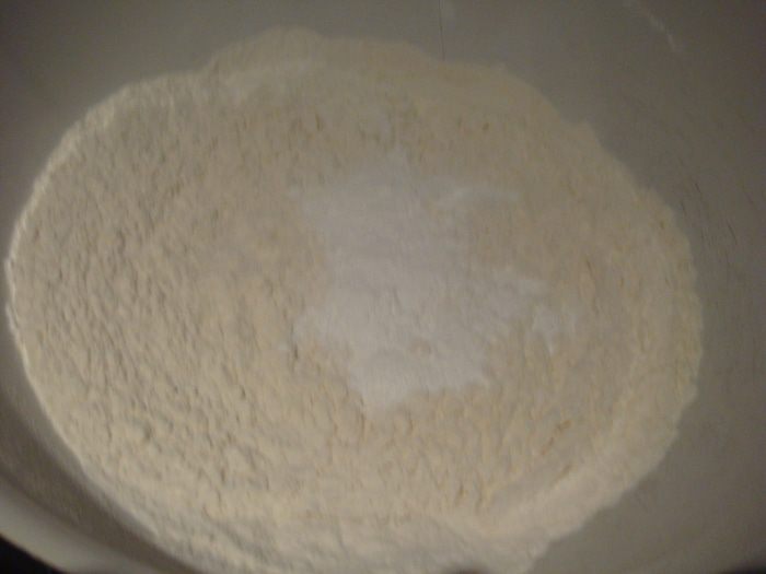 В небольшую миску просейте муку, добавьте пекарский порошок и щепотку соли.