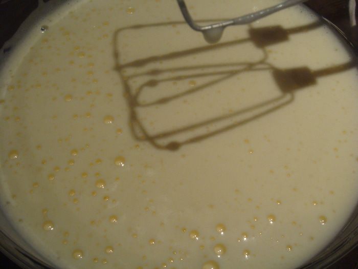 Яйца взбейте миксером 1 минуту, добавьте сахар и хорошо взбейте. Масса должна стать очень пышной, светлого цвета. В яичную смесь тоненькой струйкой добавьте оливковое масло, не переставая взбивать.