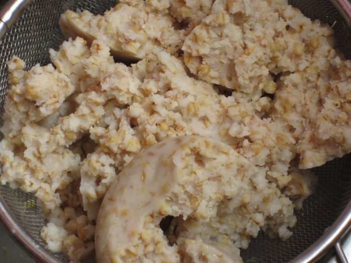 Варёную пшеницу откинуть на дуршлаг, чтобы дать стечь лишней жидкости. Размять вилкой до однородного состояния.