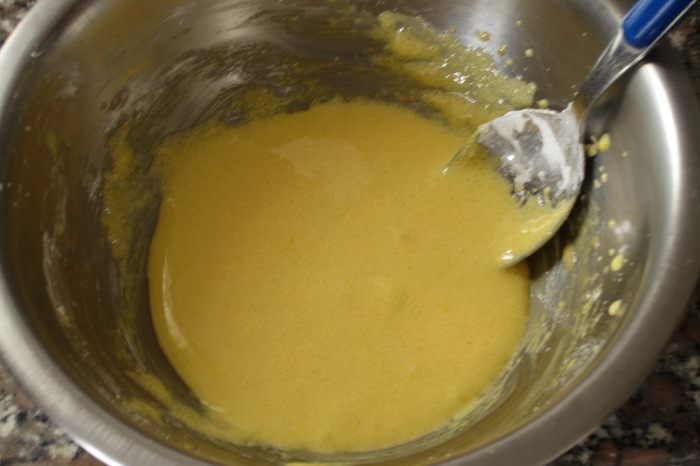 Взбить 2 желтка с 50 г сахара до побеления. Добавить крахмал и хорошо перемешать.