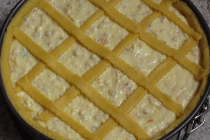 Оставшееся тесто раскатать, нарезать полоски шириной 1,5 см и выложить в виде решётки на пирог.