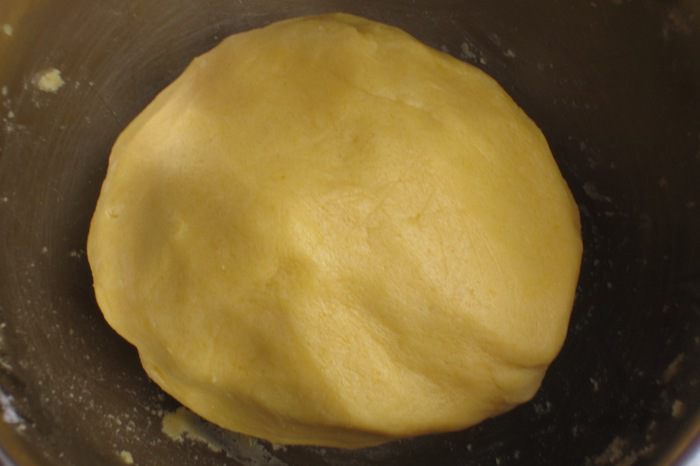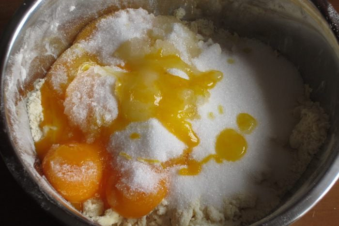 Добавить яйцо, желтки, сахар, щепотку соли и замесить тесто.