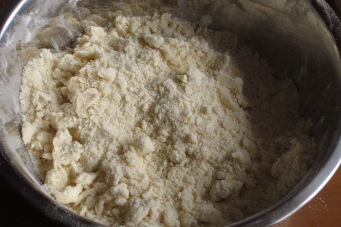 Песочное тесто: муку растереть с холодным маслом в крошку.