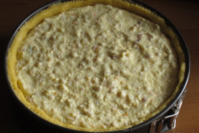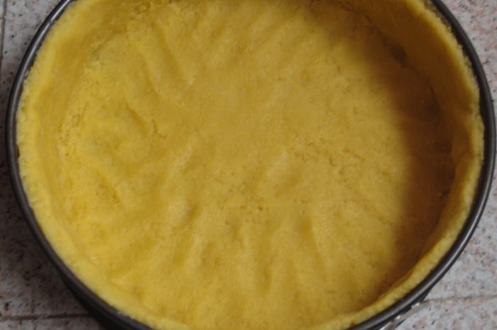 Разъёмную форму диаметром 24 см смазать сливочным маслом и присыпать мукой. Раскатать тесто и выложить в форму, формируя бортики. Лишнее тесто обрезать.