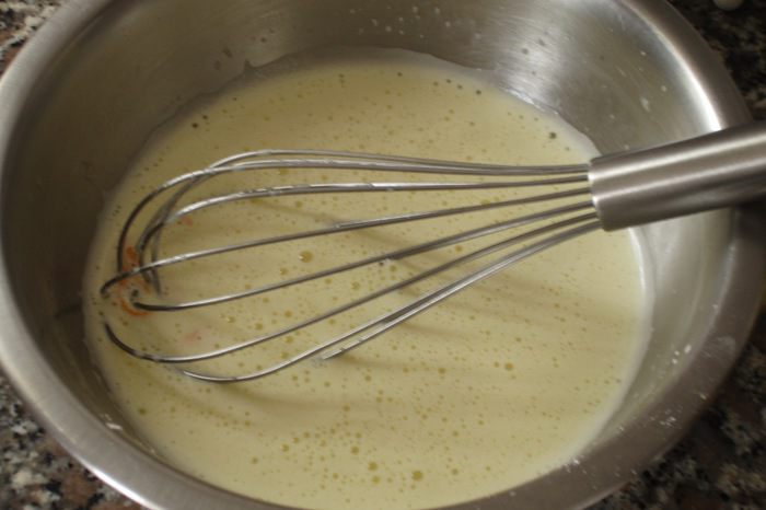 Тонкой струйкой влить молоко, постоянно работая венчиком. Хорошо перемешать, чтобы не было комочков.