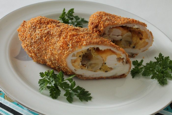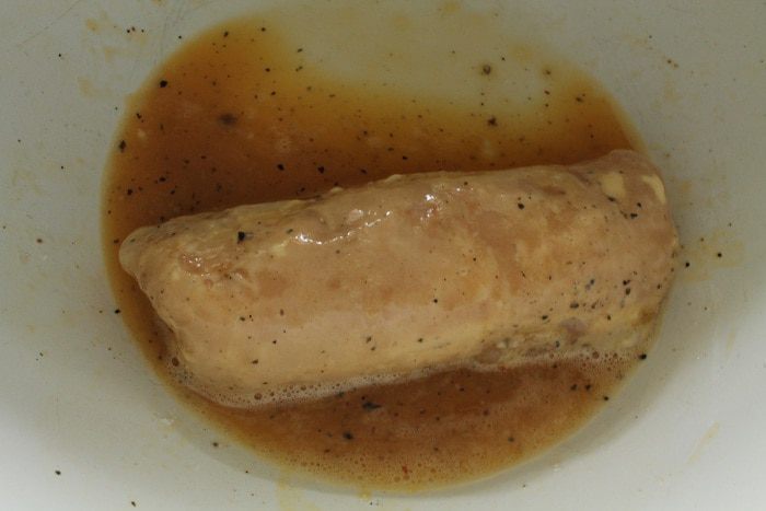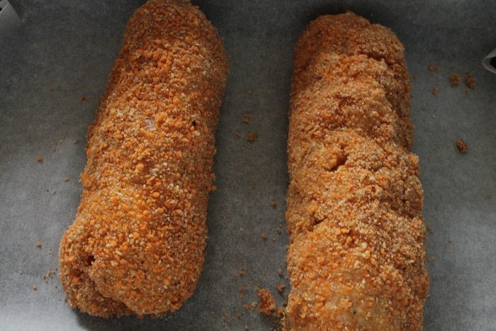 В отдельной посуде взбить яйцо с одной столовой ложкой апельсинового сока и небольшим количеством соли и перца. Окунуть каждый рулетик в эту смесь и затем обвалять в панировочных сухарях. Я покупаю сухари со специями, у них цвет и вкус лучше.