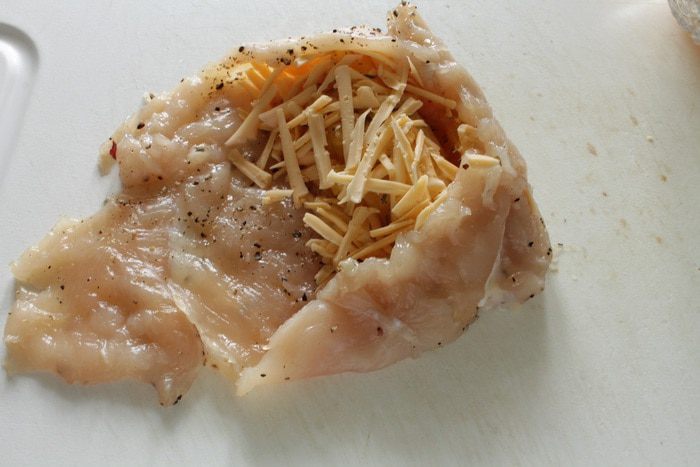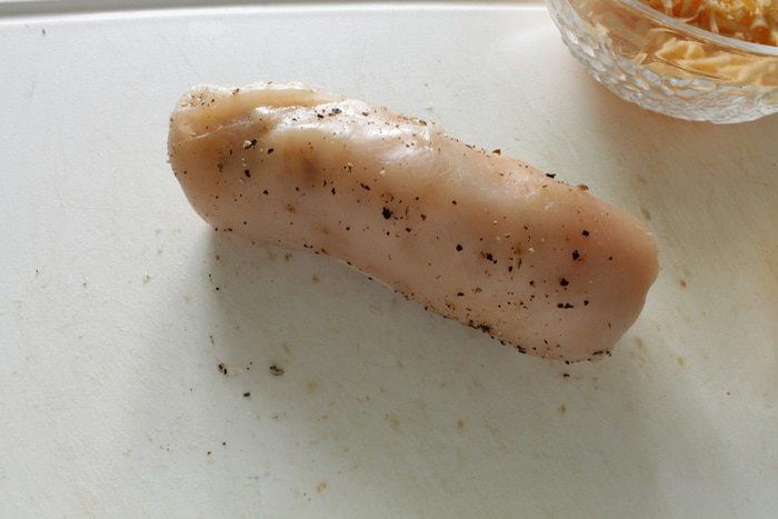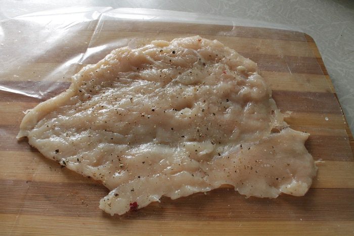 Куриное филе разрезать горизонтально на две части, каждую часть отбить с двух сторон через пленку, посолить и поперчить по вкусу.