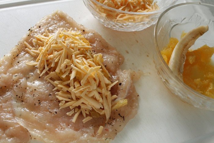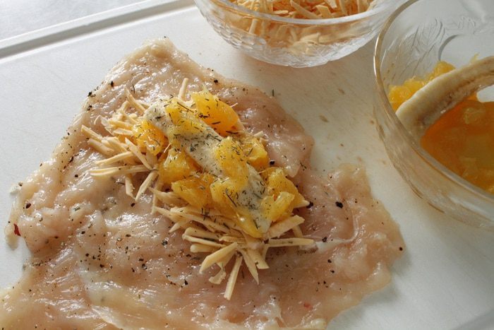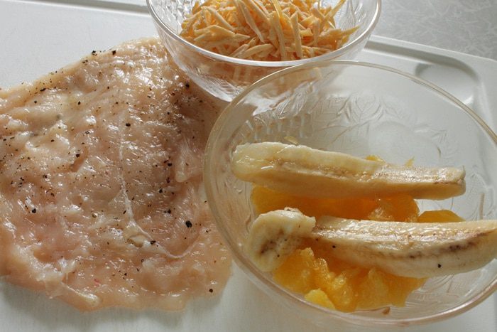 На отбитый кусок филе выкладываем сначала сыр, затем полоску банана и кусочки апельсина, немного сухого тимьяна.