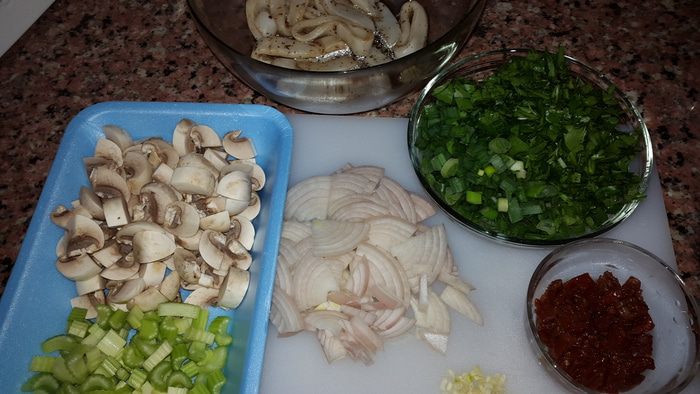 Шляпки шампиньонов моем и режем ломтиками, репчатый лук - на четверть кольца, чеснок и зелень мелко рубим. Сельдерей и вяленые помидоры режем небольшими кусочками.