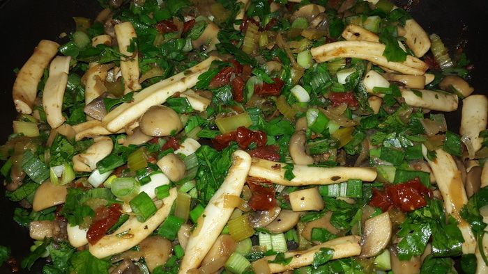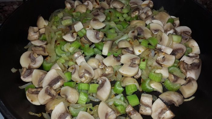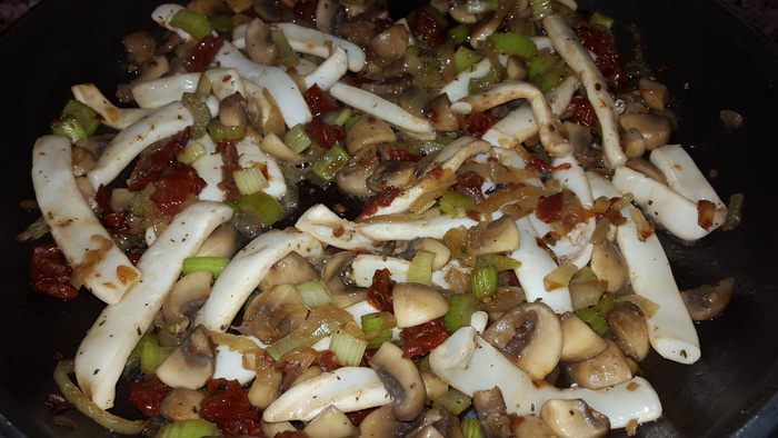 На смеси оливкового масла и масла от вяленых помидоров поджариваем лук с чесноком. Затем добавляем грибы и сельдерей, перемешиваем, тушим примерно 7 минут.