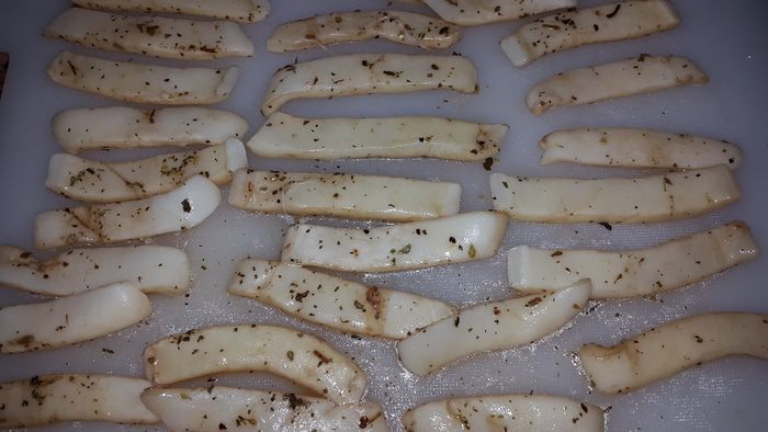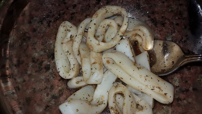 Кольца кальмаров размораживаем, моем и маринуем в смеси лимонного сока, соевого соуса, бальзамико, сушеного базилика, соли и черного перца.