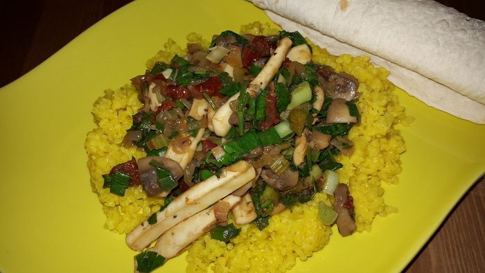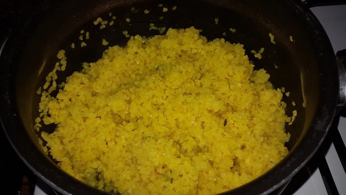 На гарнир я отварила дробленый булгур с добавлением оливкового масла, соли и куркумы.