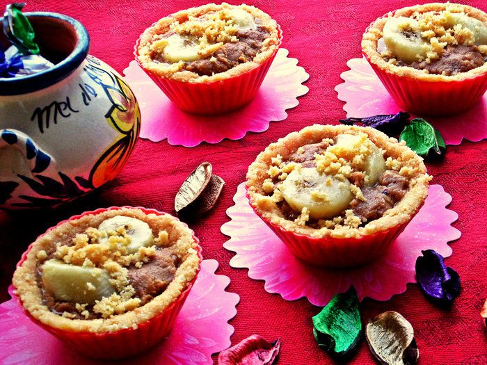 Тогда вот Вам на десерт снова корзиночки, теперь песочные с кремом на сгущёнке, ну и для баланса - с бананчиком!