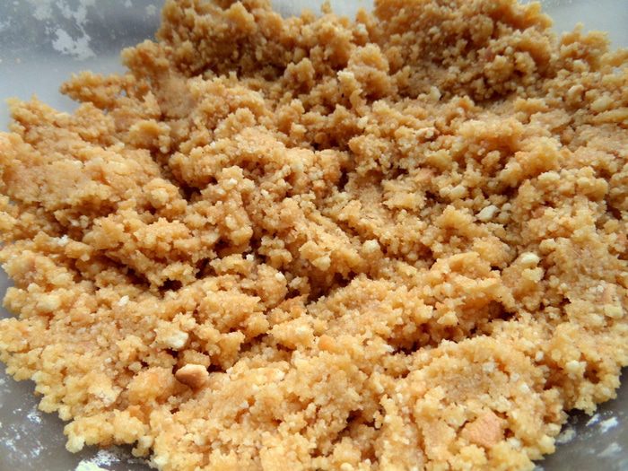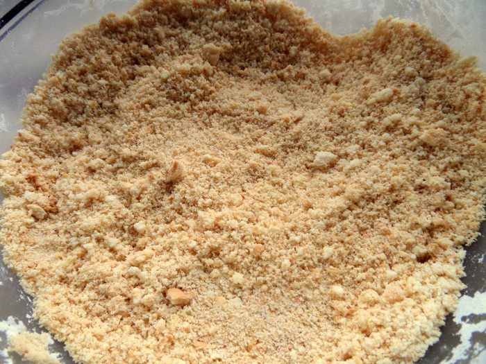 Начнём с основы. Нужно слепить порционные корзиночки или один большой корж. Для этого растолочь любое рассыпчатое печенье в крошку.
