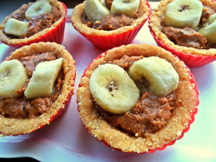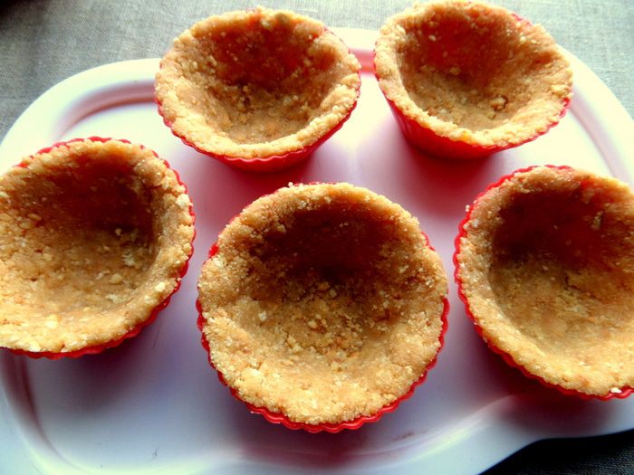 Распределить "тесто" плотно по силиконовым формочкам или сделать один большой тарт. Убрать в холодильник до застывания. Я убирала на ночь.