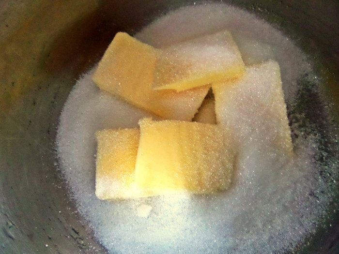 Для крема положить кусочки сливочного масла, ваниль и сахар в кастрюлю с толстым дном. Если делать одни большой тарт, количество крема увеличить вдвое!