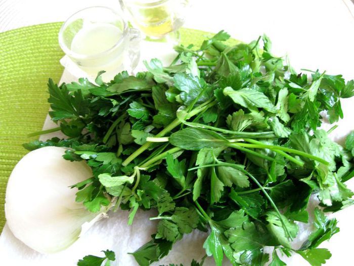 Зелень помыть, обсушить, если нет специального прибора для просушки, то просто положить на салфетку. Листья петрушки и мяты отделить от стеблей. Порезать мелко листья.