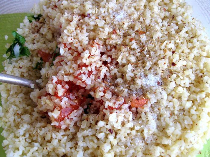 Постоянные ингредиенты салата – булгур, листья петрушки, помидоры, лук, оливковое масло, лимонный сок. Специи можно менять в диапазоне восточных приправ: некоторые добавляют перец чили и патоку граната в небольшом количестве, другие – свежемолотую корицу, семена кориандра или душистый перец. Строгих правил здесь нет, но есть одно важное правило: аромат и вкус специй не должны заглушать, а лишь оттенять вкус и аромат основных ингредиентов. Я использовала приправу Марракеш. Булгур традиционно запаривают, а потом доводят до готовности на пару. Если вы захотите импровизировать, добавьте при приготовлении табуле горсть семян подсолнечника или кунжута.