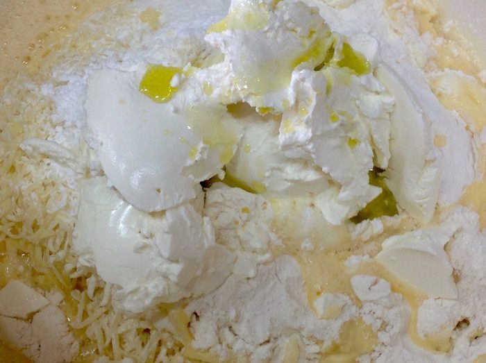 Массу из сыра и муки перемешать с яичной смесью. Добавить сметану и оливковое масло. Тщательно смешать.