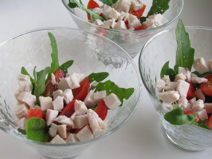 Выложить руколу в порционные салатники или креманки.
