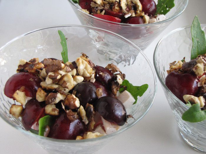 Идеальный салат для жаркого летнего дня! Черешня в нем очень гармонично сочетается с остальными ингредиентами. Если у вас есть отварная или запеченная куриная грудка, то приготовление салата займет совсем немного времени.
