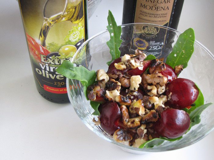 Добавить черешню и посыпать грецкими орехами. Ничего перемешивать не нужно.