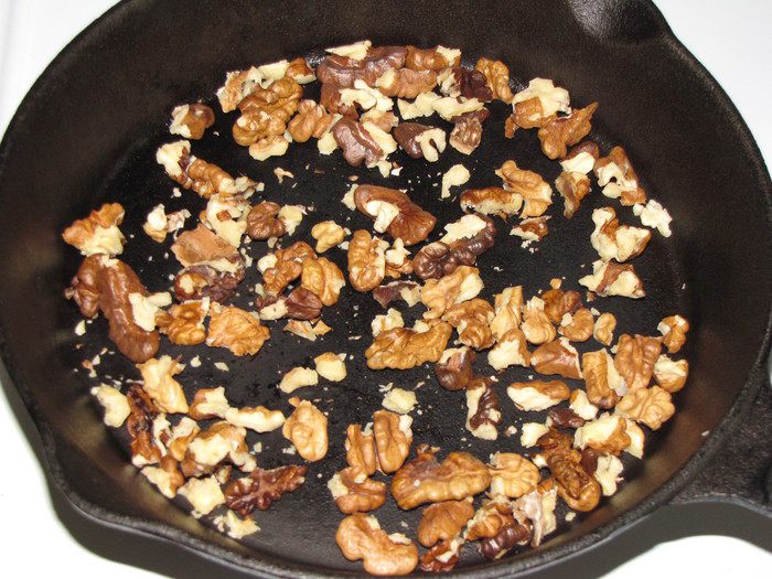 Грецкие орехи крупно порубить и обжарить на сковороде до золотистого цвета.