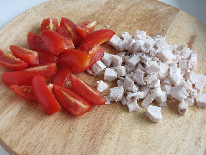 Помидоры черри разрезать на две или четыре части. Куриное филе нарезать мелким кубиком.