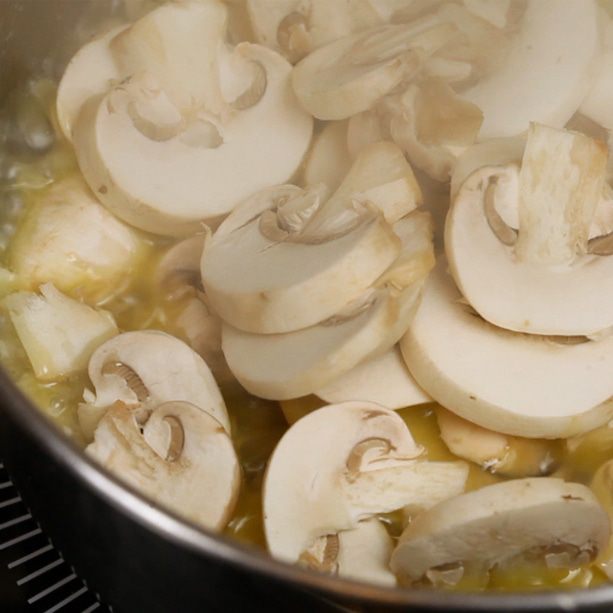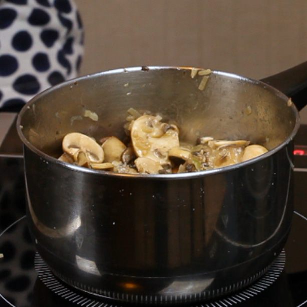 Сначала растопить сливочное масло в сотейнике, добавить нарезанные грибы и лук. Обжаривать в течение 3-4 минут, посолить и поперчить.